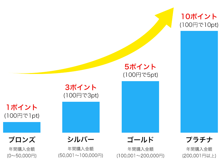 ※4月から翌3月までの購入金額に応じ、翌4月にランク変更。※最終お買上げ日から1年以内にご購入がない場合はブロンズ会員に変更となります。